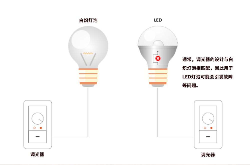當白熾燈泡與調光器組合時(shí),可適當調暗亮度以使其感覺(jué)“不黑但是足夠暗”。 但LED燈泡控制輸出的電流量很小并且非常難控制。